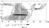 При геологической интерпретации данных учитывалось, что для нефтяных залежей характерны уменьшения плотности и намагниченности пород, с одной стороны, и повышенные содержания элементов-индикаторов углеводородов, в частности никеля, брома и ряда других, регистрируемых термомагнитным геохимическим методом (ТМГМ). На фиг.1 показаны изолинии полученных значений ковариации для магнитного, гравитационного полей и содержаний никеля ТМГМ по одному из профилей. По этому профилю выделяются две области, характеризующиеся минимальными значениями ковариации магнитного и гравитационного полей на интервалах 10-20 (северный фланг профиля) и 35-45 км (южный фланг) профиля. Область в интервале 10-20 км профиля характеризуется также повышенными значениями ковариации для поля распределения содержаний никеля. Эта область, расположенная на глубине 2-4 км и оконтуренная на фиг.1 жирной линией, и является наиболее перспективной на нахождение углеводородов. Участок на интервале 35-45 км, который не отмечался повышенными значениями ковариации геохимического поля, не рекомендовался как перспективный на углеводороды. Полученные результаты были подтверждены сейсморазведочными работами.