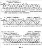 В зависимости от параметров скрутки, плавления и растяжения оптических волокон при изготовлении фильтра он приобретает избирательную прозрачность по отношению к передаче световых сигналов определенных длин волн. Иными словами, фильтр может некоторым образом сортировать входной поток “разноцветных” световых сигналов инфракрасного диапазона, поступающих извне в произвольных сочетаниях на вывод Х (на любой из четырех выводов). Сигналы, как здесь предполагается, имеют длины волн 1, 2, …, 16, равномерно распределенные на горизонтальных числовых осях диаграмм прозрачности, показанных на фиг.2. Соседние длины волн разделены одинаковыми промежутками, например 100 нм или более.
