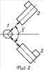 На фиг.2 представлена схема формирования плоского угла (радиана) с помощью установки, содержащей сменную многогранную эталонную призму 1 с отражающими поверхностями – гранями. Каждая из граней оптически связана со своим автоколлиматором 2. Угол между гранями определяет взаимный наклон друг другу каждого на двух автоколлиматоров на угол . Угол между гранями может меняться либо дискретно – с помощью сменных призм, либо непрерывно – с помощью оптических зеркал с переменным углом между ними. Два автоколлиматора формируют угол между двумя направлениями, определяемыми оптическими осями автоколлиматоров. Недостаток такого способа связан с тем, что он не может формировать угол расходимости светового пучка, поскольку не содержит параметров светового пучка – радиуса кривизны фронта и уровня фронта.