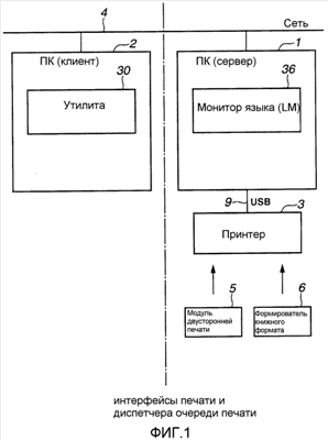 ПК 1 и ПК 2, соответственно, имеют конфигурацию аппаратных средств, аналогичную конфигурации аппаратных средств, относящихся к устройству обработки информации общего назначения, на которых, соответственно, инсталлирована определенная операционная система (далее в настоящем описании называемая “ОС”). В системе печати согласно данному варианту осуществления инсталлирован Windows (зарегистрированная торговая марка) XP корпорации Microsoft, США. При этом ПК 1 и ПК 2 соединены друг с другом при помощи сети 4, которая сконфигурирована в виде сети Ethernet (зарегистрированная торговая марка) и позволяет выполнять двусторонний обмен информацией.