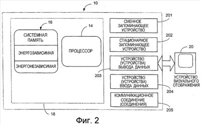 Со ссылкой на чертеж Фиг.2, на нем показан пример базовой конфигурации компьютера, в котором полностью или частично может быть реализовано описанное здесь изобретение. Компьютер 10, имеющий наиболее простую базовую конфигурацию, обычно содержит, по меньшей мере, один процессор 14 и запоминающее устройство 16. Процессор 14 исполняет команды, посредством которых обеспечивают выполнение задач в соответствии с различными вариантами осуществления настоящего изобретения. При выполнении таких задач процессор 14 может осуществлять передачу электронных сигналов в другие части компьютера 10 и в устройства, находящиеся вне компьютера 10, для получения некоторого результата. В зависимости от точной конфигурации и типа компьютера 10, запоминающее устройство 16 может представлять собой энергозависимое запоминающее устройство (например, оперативное запоминающее устройство (ОЗУ)), энергонезависимое запоминающее устройство (например, постоянное запоминающее устройство (ПЗУ) или флэш-память), либо некоторую совокупность этих двух запоминающих устройств. Эта наиболее простая базовая конфигурация изображена на Фиг.2 в виде пунктирной линии 18. Кроме того, компьютер может также иметь дополнительные элементы/функциональные возможности. Например, компьютер 10 может также содержать дополнительное запоминающее устройство (сменное 201 и/или стационарное 202), в том числе, на магнитных или оптических дисках, либо на ленте, но эти примеры не являются ограничивающими. Компьютерные средства хранения данных представляют собой энергозависимые и энергонезависимые, сменные и стационарные носители информации, реализованные любым способом или посредством любой технологии хранения информации, в том числе, исполняемых посредством компьютера команд, структур данных, программных модулей или иных данных. Компьютерными средствами хранения данных являются, в том числе, ОЗУ, ПЗУ, электрически-стираемые программируемые ПЗУ (ЭСППЗУ), флэш-память, постоянные запоминающие устройства на компакт-дисках (CD-ROM), универсальные цифровые диски (УЦД) (DVD) или иные оптические запоминающие устройства, магнитные кассеты, магнитная лента, запоминающие устройства на магнитных дисках, или иные магнитные запоминающие устройства, либо любой другой носитель информации, который может быть использован для запоминания желательной информация и к которому компьютер 10 может осуществлять доступ, но эти примеры не являются признаком, ограничивающим изобретение. Любые такие компьютерные средства запоминания данных могут являться частью компьютера 10.