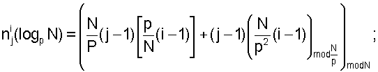 Процессор 3 БПВК-Ф имеет pN сигнальных входов по р входов на каждый из N блоков 4 перемножения с весовыми коэффициентами в первой итерации, N входов для весовых коэффициентов и N2 выходов по одному выходу, разветвленному на р выходов с каждого из блоков перемножения с весовыми коэффициентами в последней итерации, в каждом из N блоков перемножения с весовыми коэффициентами, имеющего р сигнальных входов, р входов для весовых коэффициента и один выход, в первой итерации р сигнальных входов подаются на первые входы соответствующих умножителей 5 комплексных чисел, имеющих каждый по два входа и одному выходу, на вторые входы которых подаются соответствующие весовые коэффициенты, р выходов умножителей комплексных чисел в каждом из блоков перемножения с весовыми коэффициентами подаются на соответствующие входы сумматоров 6 комплексных чисел, имеющих р входов и один выход, выходы сумматоров комплексных чисел являются выходами блоков перемножения с весовыми коэффициентами, выходы с ((j-1)p+1)-го по jp-й k-х (k=1,2,…,pl) – блоков перемножения с весовыми коэффициентами l-ой итерации соединяются с соответствующими «минус один по модулю р плюс один» входами р (i=0,1,…,p-1) k-х N блоков перемножения с весовыми коэффициентами (l+1)-й итерации, всего процессор БПВК-Ф имеет logp N итераций, количество блоков перемножения с весовыми коэффициентами в l-й итерации равно Npl-1.