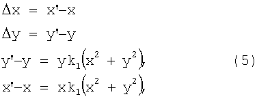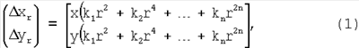 Искажения, вызванные радиальной дисторсией в декартовой системе координат, исходя из (1) определяют по формулам: