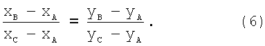 Обозначим центральную точку калибровочного контура при первоначальном направлении наблюдения А(хA, yA), после первого смещения направления наблюдения – В(хB, yB), после второго – С(хC, yC). При отсутствии радиальной дисторсии на изображении точки лежат на одной прямой (фиг.4).