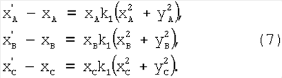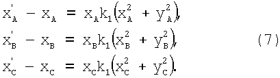 Под влиянием радиальной дисторсии положения точек А, В и С будут искажены, обозначим их положение на изображении А’, В’ и С’. Связь истинных абсцисс точек А, В и C с абсциссами точек А’, В’ и С’ на изображении (фиг.2) с учетом формулы (5) выражают: