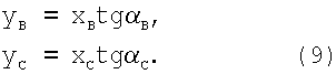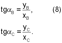 где (xA, yA), (хB, yB), (хC, yС) – координаты центральных точек А, В и С калибровочных контуров при первоначальном направлении наблюдения, после первого смещения направления наблюдения, после второго соответственно, (xA‘, yA‘), (хB‘, yB‘), (хC‘, yС‘) – координаты этих точек на изображении, искаженном радиальной дисторсией, A, B, С – углы между осью абсцисс и прямыми, образованными точкой начала отсчета координат и точками А, В и С соответственно.