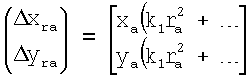Искажения, вызванные радиальной дисторсией, определяются [R.Y.Tsai. «A versatile camera calibration technique for high-accuracy 3D machine vision metrology using off-the-shelf TV cameras and lenses», IEEE Trans. Rob. Autom, RA-3(4), p.323-344, 1987] по формуле: