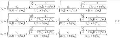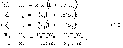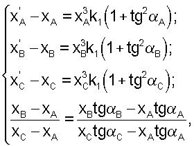 Полученные корни xA, xB, xC подставляют в четвертое уравнение системы (10) и получают уравнение с одной неизвестной k1, которое решают с использованием численных методов [Демидович Б.П., Марон И.А. Основы вычислительной математики. – М.: Наука. Гл. ред. физ.-мат.лит., 1966].