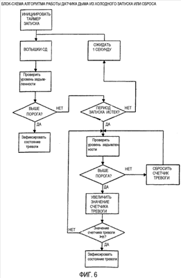 фиг. 6 – блок-схему алгоритма работы датчика опасности в первой форме второго варианта осуществления, причем первая форма является датчиком дыма, который измеряет уровень задымленности, согласно изобретению;