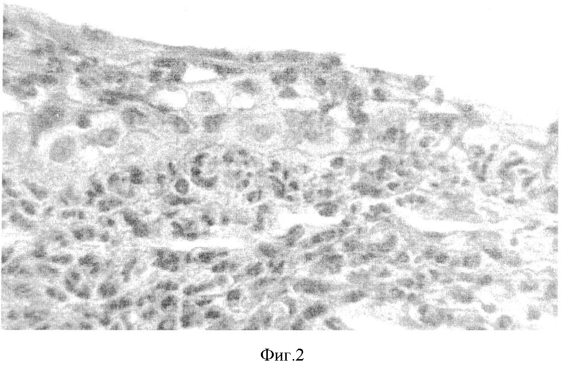 Гнойный кератит легкой степени характеризовался следующими признаками (фиг.1): площадь поражения роговицы до 3 мм в диаметре, затрагиваются только поверхностные слои роговой оболочки. На гистологической (фиг.2) картине видна дегенерация клеток эпителиального пласта. Также обращало на себя внимание истончение стромы. Это было справедливо как в отношении собственного вещества роговицы, так и в отношении переднего ее эпителия. Эпителиальный пласт характеризуется наличием умеренной эксфолиации и дегенерации эпителиоцитов, инфильтрацией лейкоцитами. Собственное вещество роговицы имело признаки отека ткани. Отдельные Коллагеновые волокна стромы были значительно утолщены и разрыхлены. В отдельных препаратах отмечена незначительная васкуляризация стромы собственного вещества роговицы. Цилиарное тело изменено не было. Таким образом, клиническая и гистологическая картина подтверждает наличие кератита легкой степени тяжести.