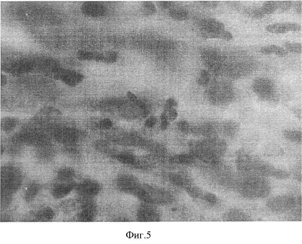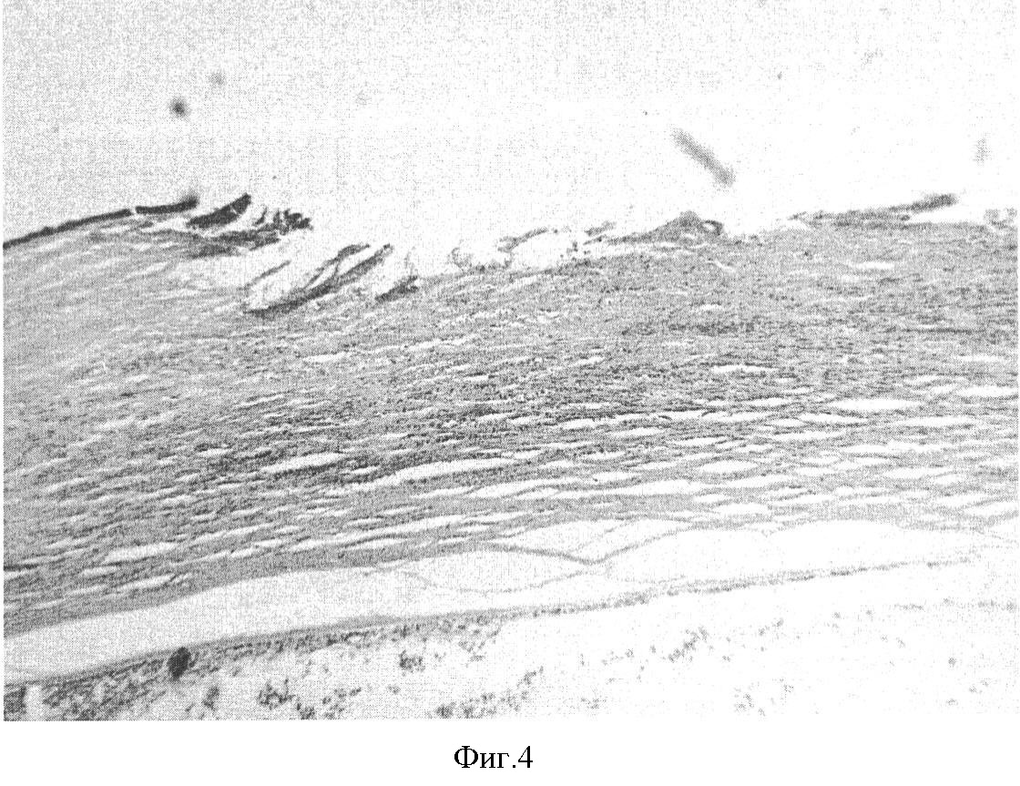 Тяжелая степень характеризовалась: площадь поражения роговицы свыше 6 мм в диаметре (фиг.3), гипопион более 2 мм высотой; и с площадью поражения от 3 до 6 мм в диаметре, но с глубокой гнойной инфильтрацией. На гистологической (фиг.4) картине мы видим образование кератита средней степени тяжести. При осмотре поверхностных слоев роговицы выявили нарушение послойной дифференцировки эпителия. Он имел неравномерную толщину и диспластические изменения. По периферии язвенной поверхности эпителий был отечный, с элементами десквамации и приобретал черты ороговевающего. Отмечалась диффузная инфильтрация лейкоцитами и эозинофилами как эпителиальных, так и стромальных слоев. Имели место выраженные явления межуточного отека ткани собственного вещества роговицы. Коллагеновые волокна стромы были умеренно утолщены, хаотически расположены, разрыхлены, неравномерно прокрашены. В ряде случаев была заметна их фрагментация. В строме просматривались новообразованные сосуды. Сосуды цилиарного тела находились в дилятированном и полнокровном состоянии. В единый конгломерат в области отростков сформировался фибринозный экссудат.