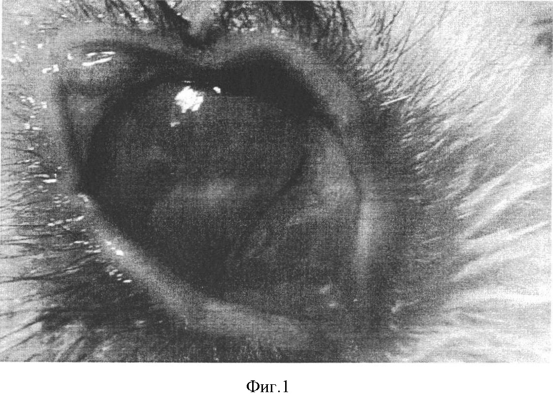 Способ осуществляют следующим образом. Перед началом эксперимента животным проводят общепринятую анестезию, например, с помощью препарата Гексенал (производство фирмы «Medro Inc.», Латвия), при этом расчетная доза составляет 0,2 мг на кг веса животного. Стерильным скребцом проводят скарификацию всей поверхности роговицы, после чего надевают на глаз предварительно инфицированную одним из видов дрожжевых грибов мягкую контактную линзу (МКЛ). Веки сшивают на 3 суток – для получения кератита легкой степени тяжести, 5 суток – для получения кератита средней степени тяжести, 8 суток – для получения тяжелого кератита.