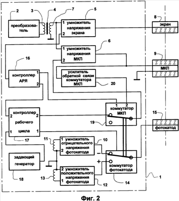 Функциональная схема источника питания ЭОП и входящих в него элементов и блоков, выполненная в соответствии с предлагаемым способом подачи питающих напряжений, представлена на фиг.2. Источник питания 1 содержит преобразователь 2, подключенный к первичной обмотке 3 трансформатора 4. Первые входы умножителей напряжения экрана 5 и МКП 6 подключены к высокопотенциальному выводу вторичной обмотки 7, а низкопотенциальный вывод вторичной обмотки 7 соединен с общей шиной источника питания. Выход умножителя напряжения экрана 5 соединен с экраном 8. Выход умножителя напряжения МКП 6 соединен с выходом МКП 9. Вход МКП 9 соединен с общей шиной источника питания. Умножитель отрицательного напряжения фотокатода 10 первым входом соединен с высокопотенциальным выводом вторичной обмотки 11, умножитель положительного напряжения фотокатода 12 первым входом соединен с высокопотенциальным выводом вторичной обмотки 13. Вторые низкопотенциальные выводы вторичных обмоток 11 и 13, а также вторые входы умножителей напряжения 10 и 12 соединены с общей шиной источника питания. Выходы умножителей напряжения 10, 12 соединены с входами коммутатора фотокатода 14, выход которого соединен с фотокатодом 15. Вход контроллера АРЯ 16 соединен со вторым, низковольтным входом умножителя напряжения экрана 5. Второй выход контроллера АРЯ 16 соединен со вторым входом контроллера рабочего цикла 17, первый вход которого соединен с выходом задающего генератора 18. Вход коммутатора МКП 19 соединен со вторым выходом контроллера рабочего цикла 17. Выход коммутатора МКП 19 соединен со вторым входом умножителя напряжения МКП 6. Первый вход сигнала обратной связи коммутатора МКП 19 соединен с первым выходом контроллера АРЯ 16, а второй вход сигнала обратной связи соединен с выходом усилителя обратной связи МКП 20, вход которого соединен с выходом МКП 9 и выходом умножителя напряжения МКП 6.