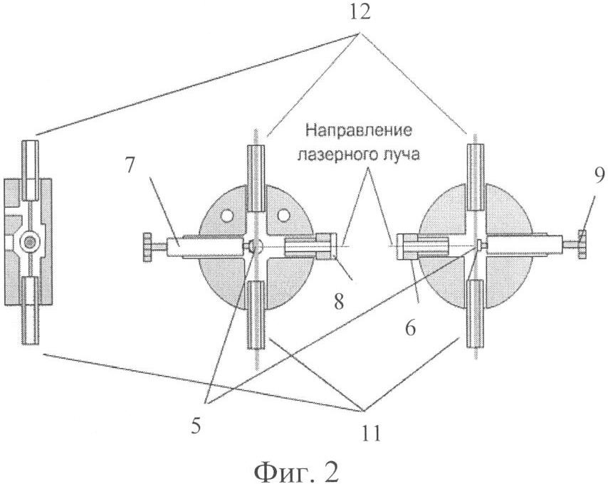 На фиг.2 представлены основные проекции еще одного варианта узла ввода проб, где 5 – мишень, 6 – вкладыш, 7 – вкладыш,11 – патрубок для забора пробы, 12 – патрубок для вывода газового потока из области ионизации, 8 – кварцевое окно, 9 – тефлоновый шток.