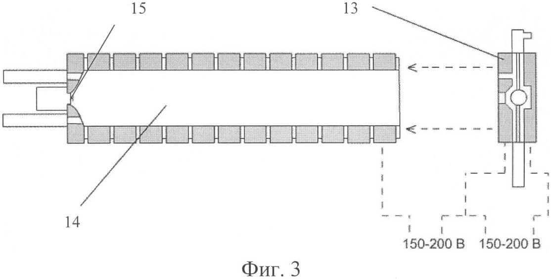 На фиг.3 схематично представлена схема присоединения узла ввода проб 13 к дрейфовой трубке 14.