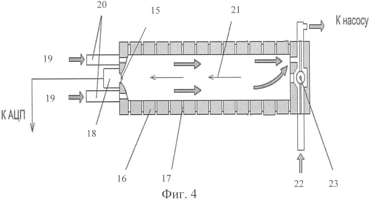 На фиг.4 схематично представлен вариант дрейфовой трубки 14, соединенной с узлом ввода проб 13, где 15 – коллектор, 16 – кольцевой электрод, 17 – диэлектрическое кольцо, 18 – усилитель, 19 – направление буферного потока, 20 – патроны с молекулярными ситами, 21 – направление дрейфа ионов, 22 – пробозаборный поток, 23 лазерный луч, перпендикулярный к рисунку. Дрейфовая трубка 14 представляет собой систему чередующихся металлических кольцевых электродов 16, разделенных диэлектрическими кольцами 17.