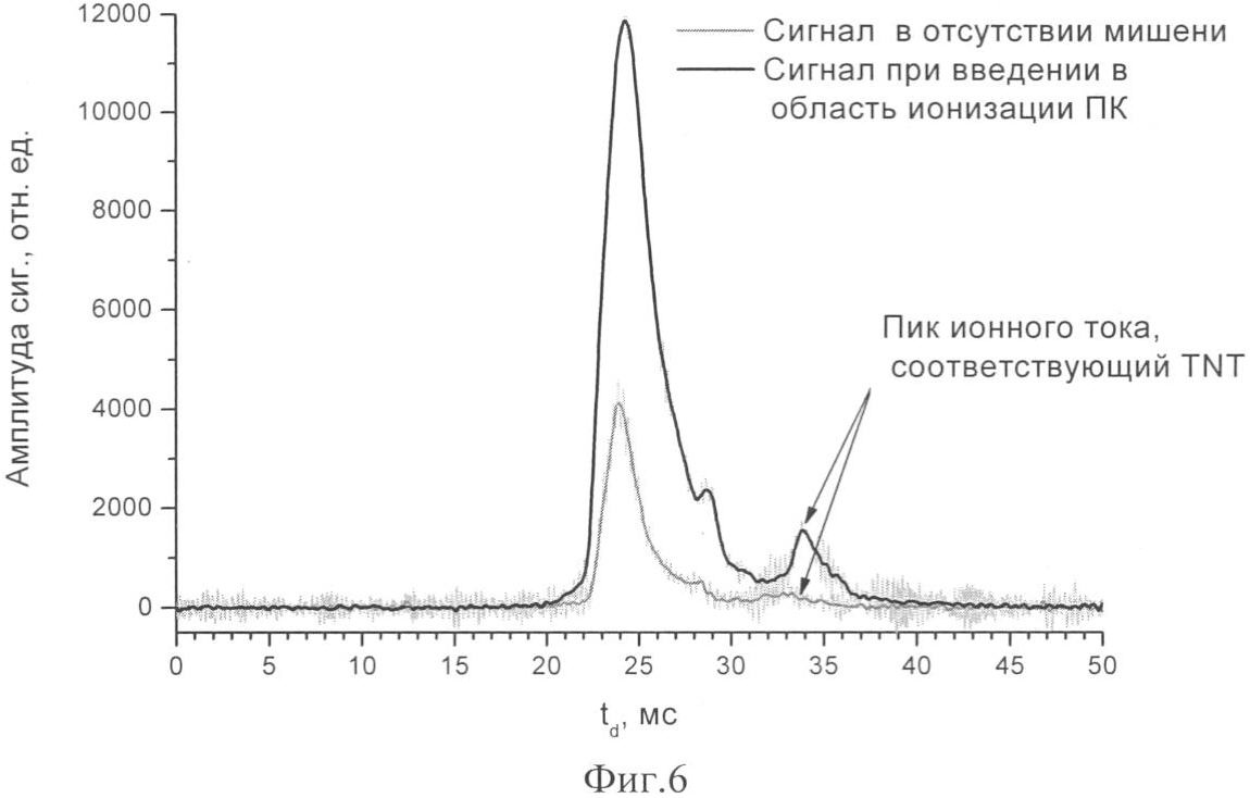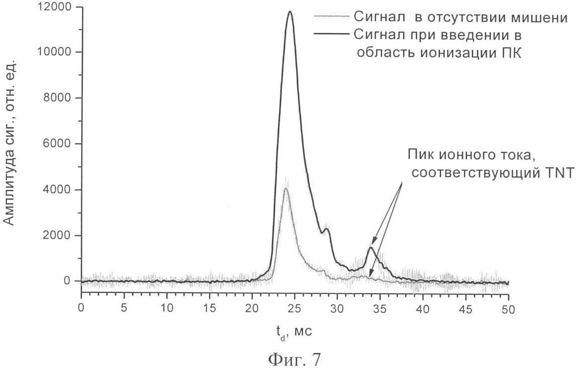 На фиг.7 представлен спектр ионной подвижности сигнала фоновой ионизации и сигнала ионизации паров TNT с мишени из НПК (отрицательные ионы; =532 нм, q=2·107 Вт/см2; режим разрушения мишени).