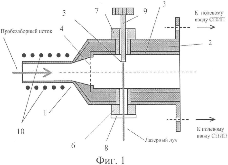 На фиг.1 схематично представлен продольный разрез варианта узла ввода проб, где 1 – корпус, 2 – тефлоновый изолятор, 3 – металлический стакан, 4 – сетка, 5 – твердотельная мишень, 6, 7 – вкладыши, 8 – кварцевое окно, 9 – тефлоновый шток, 10 – нагревательный элемент.