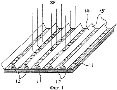 [0028] На фиг.1 показан солнечный концентратор согласно изобретению. Здесь ряды клиновидных отражателей 13 чередуются с солнечными элементами 12. Они установлены на солнечную панель 11 с сотовой ячеистой конструкцией с применением специальных креплений. Такую конструкцию обычно выполняют из алюминиевых ячеек, расположенных между двумя облицовочными листами из полимера, армированного углеродным волокном (CFRP). Солнечное излучение падает на панель 11. Оно попадает на солнечные элементы 12 либо непосредственно, либо после отражения от отражающего покрытия отражателей 13. В соответствии с одним из предпочтительных вариантов осуществления ширина ряда солнечных элементов 12 равна ширине ряда клиновидных отражателей 13 в зависимости от коэффициента геометрической концентрации. Например, ширина рядов одинакова, когда коэффициент геометрической концентрации составляет 2:1. Угол наклона отражателя в зависимости от коэффициента геометрической концентрации равен примерно 60° и равен ровно 60° в том случае, когда коэффициент геометрической концентрации составляет 2:1. Когда коэффициент геометрической концентрации составляет 2:1, это означает, что два квадратных метра солнечного излучения концентрируются на одном квадратном метре солнечных элементов. Учитывая, что высокоэффективные солнечные элементы чрезвычайно дороги, такая концентрация очень привлекательна с точки зрения сокращения стоимости солнечной панели.