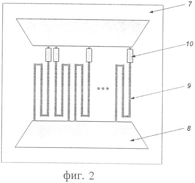 Устройство быстродействующего однофотонного детектора 1 представлено на фиг.2. На подложке 7 расположены контактные площадки 8, соединенные с несколькими одинаковыми сверхпроводящими полосками 9, подключенными параллельно. Последовательно с каждой полоской 9 подключается полосковый резистор 10. При этом полоски, выполненные из пленки сверхпроводника, имеют толщину порядка длины когерентности, а ширину – меньше глубины проникновения магнитного поля. Резисторы для всех полосок выполнены одинаковыми, а сопротивление резисторов составляет 0.5-500 Ом, в зависимости от кинетической индуктивности сверхпроводящих полосок оно подбирается так, чтобы переключение в резистивное состояние одной из полосок не приводило к переключению в резистивное состояние остальных полосок, т.е., чтобы величина тока в этих полосках не превышала величину критического тока. Полоски имеют форму меандра и исполнены с фактором заполнения k более 0,5, определяемым по формуле