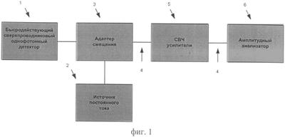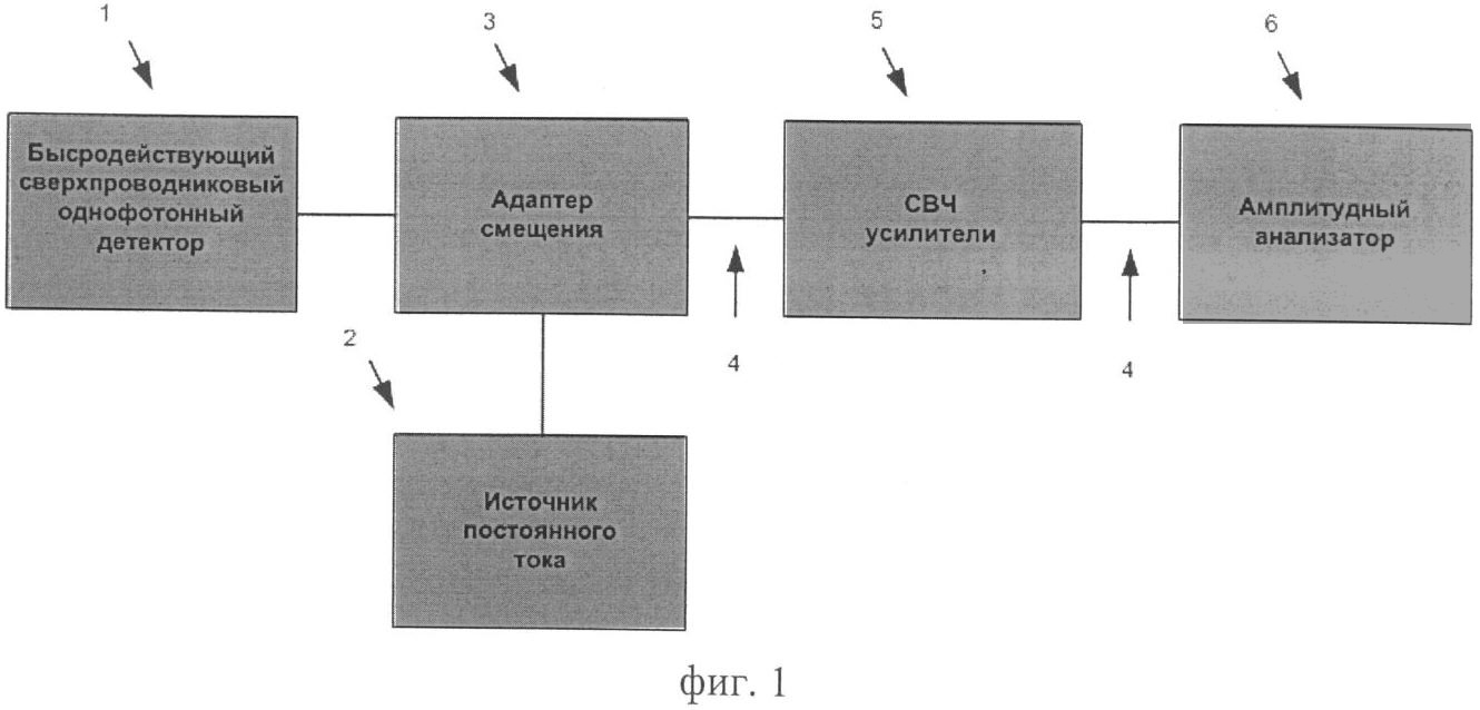 Быстродействующий сверхпроводниковый однофотонный детектор 1 подключается к источнику постоянного тока 2 и высокочастотному тракту съема сигнала через адаптер смещения 3. Высокочастотный выход адаптера смещения 3 подключается через коаксиальный кабель 4 к СВЧ-усилителям 5 и далее через второй коаксиальный кабель 4 ко входу амплитудного анализатора 6, регистрирующего число фотонов, падающих на быстродействующий сверхпроводниковый однофотонный детектор. Наличие амплитудного анализатора в блок схеме детектора позволяет анализировать амплитуду импульса фотоотклика детектора и тем самым регистрировать число падающих фотонов.