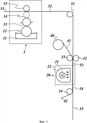 На фиг.1 изображена секция 1 печати, секция 20 экспонирования, огибной ролик 31 и три валика 32, 33, 34. К секции 1 печати подают пленку-основу 51. Обработанную в секции 1 печати пленку-основу 51 подают в виде пленки 52 по огибному ролику 31 к паре валиков 32, 33, которая наносит на пленку 52 переводную пленку 41, разматываемую с рулона 40 переводной пленки. В результате получается пленка 53. Обработанную в секции 20 экспонирования пленку 53 подают в виде пленки 54 к валику 34, где несущую пленку 42 отделяют от пленки 54, и в качестве оставшейся пленки остается пленка 55.