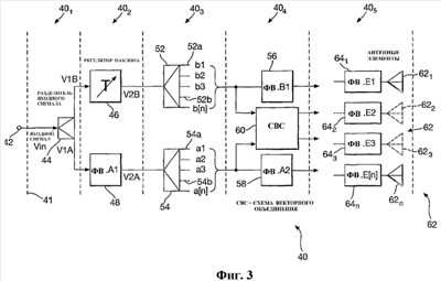 На фиг.3 показана система 40 фазированной антенной решетки, которая имеет регулируемый угол электрического наклона. Система 40 включает в себя пять последовательных функциональных областей 401-405, называемых в известных технических решениях «уровнями» и показанных между парами пунктирных линий, таких, как линия 41. Система имеет вход 42 для передаваемого РЧ сигнала несущей: вход 42 подсоединен в качестве входа к разделителю 44 мощности, выдающему два выходных сигнала, имеющих амплитуды V1A, V1B, которые становятся входными сигналами для регулируемого фазовращателя 46 и первого фиксированного фазовращателя 48, соответственно. Фазовращатели 46 и 48 могут также рассматриваться как средства временной задержки. Они выдают соответствующие выходные сигналы V2В, V2А в два разделителя 52 и 54 мощности. Разделители 52 и 54 мощности имеют n выходов, таких, как 52а и 54а, соответственно: здесь n – положительное целое число, равное 2 или большее, а обозначенные пунктирными линиями выходы 52b и 54b показывают, что выход в каждом случае можно повторить, если это потребуется, для достижения любого желательного размера фазированной антенной решетки.