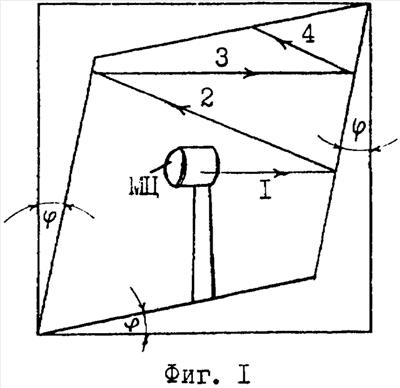 При таком положении цилиндра в БЗ БЭК луч 1, зеркально отраженный от боковой цилиндрической поверхности, попадает на одну боковую стену камеры (луч 2) и зеркально отражается от нее в сторону противоположной боковой стены (луч 3), после отражения луча 3 от второй боковой стены луч 3 вновь отражается от первой боковой стены, отражается от нее (луч 4) и попадает на потолок БЭК. Можно проследить дальнейшую судьбу лучей, которые так и не попадают в БЗ. При каждом отражении лучи ослабевают на 15 дБ, многократно отражаются от стен, пола и потолка БЭК и поглощаются ими (фиг.1).