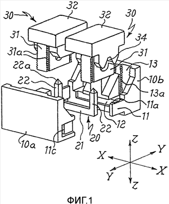 Внутри каждой половины 10a, 10b сформированы направляющие 13, предназначенные (после скрепления двух половин 10a, 10b) для формирования направляющей для скольжения в направлении, параллельном направлению Z-Z скользящего контакта 30, предназначенного для формирования механического элемента фиксации и удержания соответствующих проводов 1, 2.