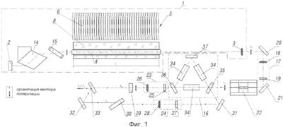 Параметрический генератор 16 света выполнен по известной трехзеркальной кольцевой схеме и включает три нелинейных кристалла 34 КТР и дихроичные зеркала 35 и 36, а также полностью отражающее зеркало 37, установленные под углом 120° друг к другу. Дихроичное зеркало 35 пропускает излучение с первой длиной волны, лежащей в диапазоне 1 мкм, и не пропускает излучение со второй длиной волны в диапазоне 1,5 мкм. Дихроичное зеркало 36 пропускает излучение со второй длиной волны, но не пропускает излучение с первой длиной волны.