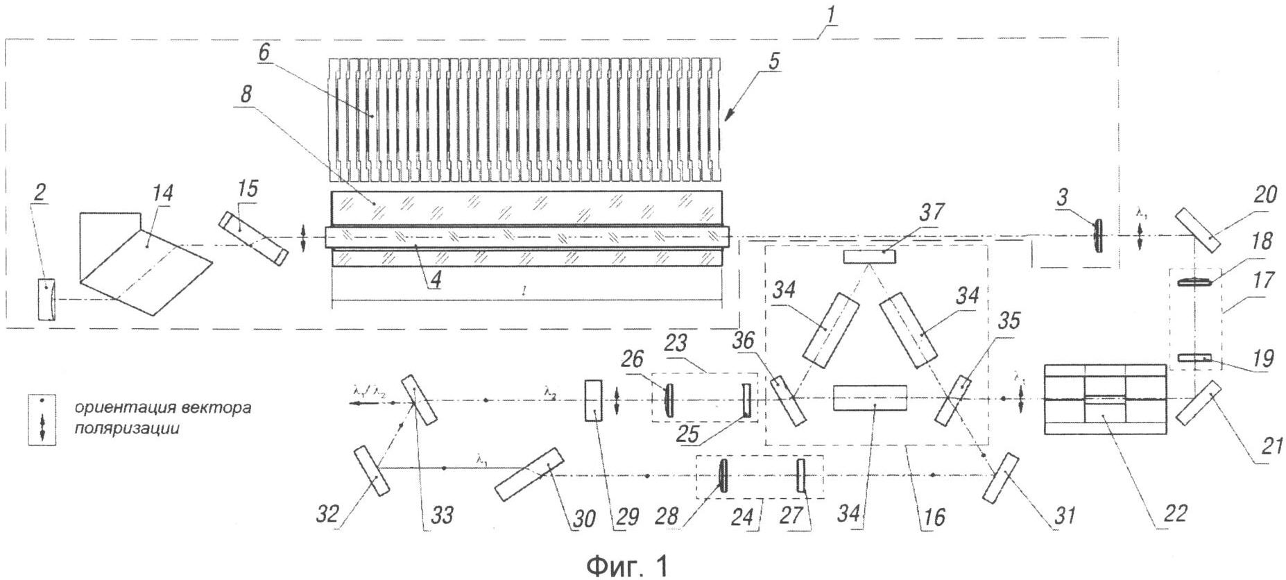 Твердотельный моноимпульсный лазер 1 образует задающий генератор двухволнового лазерного генератора, оптическая схема которого показана на фиг.1. Помимо лазера 1, этот двухволновый лазерный генератор включает параметрический генератор 16 света, обратный телескоп 17, образованный сферическими линзами 18 и 19 и оптически подключенный к выходу лазера 1, зеркала 20 и 21, электрооптический ключ 22, прямые телескопы 23 и 24, образованные сферическими линзами 25, 26 и 27, 28 соответственно, полуволновую фазовую пластину 29, поляризатор 30, глухие зеркала 31 и 32 и дихроичное зеркало 33. Увеличение прямых телескопов 23 и 24 может быть равным увеличению обратного телескопа 17. Дихроичное зеркало 33 выполнено так, чтобы отражать излучение на одной волне генерации двухволнового лазерного генератора и пропускать излучение на другой длине волны генерации. Например, зеркало 33 может отражать излучение с первой длиной волны, лежащей в диапазоне 1 мкм, и пропускать излучение со второй длиной волны в диапазоне 1,5 мкм.
