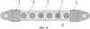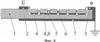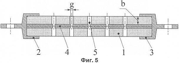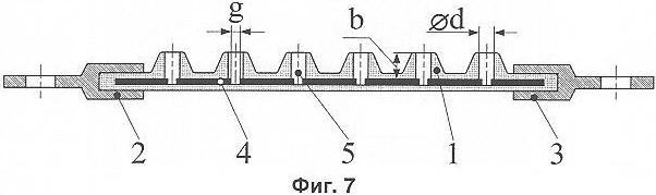 На фиг.7, 8 показан вариант разрядника с изоляционным телом 1 в виде гибкой ленты с утолщениями в местах выходов разрядных камер 5 на поверхность изоляционного тела 1 и с промежуточными электродами 4 в виде круглых металлических шайб или шайб из графита. Этот вариант характеризуется наиболее экономным использованием изоляционного материала для изготовления изоляционного тела 1, так как необходимая толщина b изоляции, определяющая размер камеры по ее оси, обеспечивается локально в месте выхода камеры на поверхность изоляционного тела.