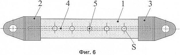 На фиг.5, 6 показан вариант разрядника с цилиндрическим изоляционным телом 1 и с разрядными камерами 5, проходящими от промежуточных электродов 4 к верхней и к нижней поверхностям изоляционного тела 1. Таким образом, разрядные камеры 5 выполнены в виде сквозных отверстий, проходящих через изоляционное тело 1 и определяющих разрядные воздушные промежутки между промежуточными электродами 4. Поперечное сечение камеры может иметь прямоугольную (как показано на фиг.1-4), круглую (как показано на фиг.6) или иную форму. Вариант по фиг.5, 6 обладает большей технологичностью по сравнению с вариантом, показанным на фиг.1-4, т.к. для его изготовления может быть применена, например, высокотехнологичная гидроабразивная резка материалов, с использованием которой возможно быстрое и точное выполнение сквозных отверстий.