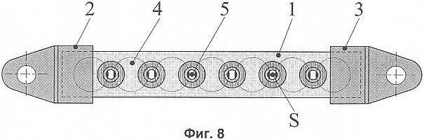 на фиг.7 на виде спереди, в сечении, показан вариант разрядника с изоляционным телом, имеющим утолщения в местах выхода на поверхность тела разрядных камер;