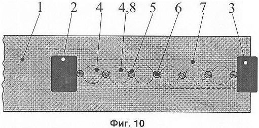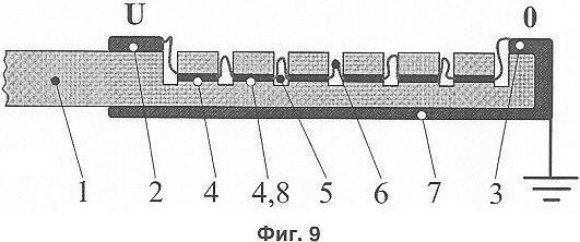 Дополнительный электрод 7 электрически соединен со вторым основным электродом 3, т.е. он также имеет нулевой потенциал. Таким образом, высокое напряжение между основными электродами 2 и 3 приложено также между первым основным электродом 2 и дополнительным электродом 7. Ширина плоского изоляционного тела 1 выбирается такой, чтобы электрическая прочность по верхней и нижней поверхностям плоского изоляционного тела по кратчайшему расстоянию между электродами 2 и 7 была выше, чем электрическая прочность между основными электродами 2 и 3. Изоляционные свойства материала, из которого изготовлено изоляционное тело 1, и его толщина должны быть такими, чтобы их электрическая прочность также была выше, чем разрядное напряжение разрядника между основными электродами 2 и 3. Это необходимо для того, чтобы при воздействии перенапряжения разряд развивался от основного электрода 2 через искровые промежутки между промежуточными электродами 4 ко второму основному электроду 3, а не напрямую между основным электродом 2 и дополнительным электродом 7. Благодаря наличию дополнительного электрода в этом варианте разрядника обеспечиваются малые разрядные напряжения, что позволяет ограничивать перенапряжения до весьма низкого уровня. Более подробно механизм влияния дополнительного электрода на разрядные напряжения поясняется фиг.11, 12.