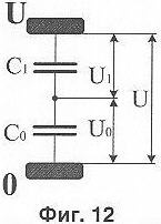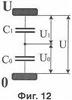 На фиг.11 показан развернутый фрагмент принципиальной электрической схемы варианта по фиг.9, содержащий первый основной электрод 2, ближайший к нему промежуточный электрод 4 и дополнительный электрод 7. Между электродами 2 и 4 существует емкость C1, а между электродами 4 и 7 – емкость С0. Эти емкости соединены последовательно, причем при воздействии импульса перенапряжения к ним прикладывается напряжение U. Напряжение U1 на емкости C1, т.е. напряжение на искровом промежутке между первым основным электродом 2 и ближайшим к нему промежуточным электродом 4, в относительных единицах определяется по формуле