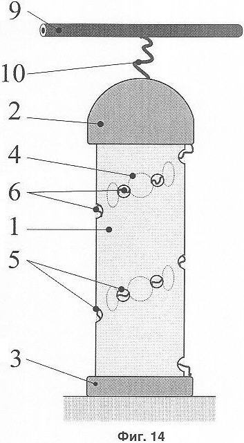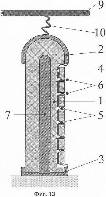 На фиг.13 показан вариант разрядника с изоляционным телом 1 в виде цилиндра со скругленным окончанием. Таким образом, изоляционное тело 1 в данном варианте содержит цилиндрический полый компонент и сплошной компонент, образующий скругленное окончание. Дополнительный электрод 7 расположен внутри полого компонента изоляционного тела 1 и также имеет форму цилиндра со скругленным окончанием. Первый основной электрод 2 разрядника через воздушный искровой промежуток 10 подключен к проводу 9 ВЛ. При возникновении перенапряжения на проводе 9 сначала перекрывается искровой промежуток 10, и в результате высокое напряжение прикладывается к первому основному электроду 2. Далее процесс работы разрядника протекает так, как это было описано выше со ссылкой на фиг.1-4.