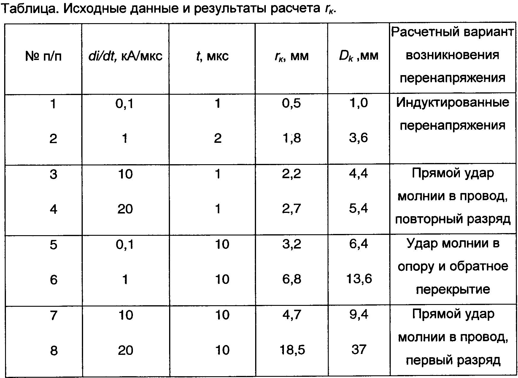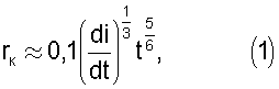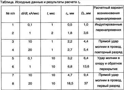 В Таблице приведены расчетные значения радиуса rk по формуле (1) для различных, наиболее характерных значений di/dt и t. Следует отметить, что радиус канала rk и соответственно его диаметр Dk=2rк являются функциями времени, т.е. с увеличением времени они возрастают. Данные расчета приведены в последовательности, дающей постепенное увеличение радиуса стримерного канала.