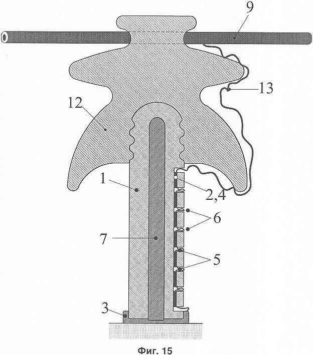 На фиг.15 показан вариант ВЛ по изобретению с разрядником, выполненным с использованием изоляционного колпачка и металлического штыря изолятора. Вариант выполнения разрядника аналогичен вариантам, показанным на фиг.13, 14, но отличается тем, что вместо искрового промежутка 10 использован изолятор 12 линии электропередачи. Таким образом, в этом варианте дополнительный электрод 7 разрядника выполняет также функцию штыря, на котором устанавливается линейный изолятор. Изоляционное тело 1 разрядника выполняет также функцию полимерного изоляционного колпачка, который обычно применяется при установке линейного изолятора на штырь. Как и в варианте по фиг.13, 14, полый компонент изоляционного тела и дополнительный электрод имеют круглое поперечное сечение. Для упрощения изготовления разрядника его первый основной электрод 2 может быть выполнен конструктивно таким же, как промежуточные электроды 4.