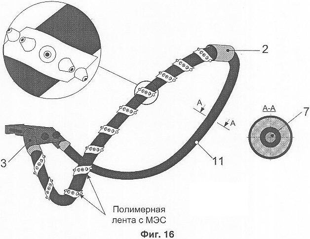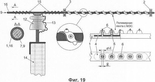 На фиг.19 показан фрагмент ВЛ с защищенными проводами, в которой используется вариант разрядника, оптимизированный применительно к подобной ВЛ. На опоре 14 из проводящего материала (железобетонной, стальной и т.п.) установлен изолятор 12, к которому при помощи металлического крепежного средства 15 крепится провод 9, имеющий изоляционный защитный слой 16. На проводе устанавливается зажим, имеющий контакт с крепежным средством 15 и выполняющий функцию второго основного электрода 3 разрядника по фиг.7, 8. Первый основной электрод 2 выполнен в виде прокусывающего зажима. Он обеспечивает фиксацию разрядника на проводе и контакт с жилой провода 9, отрезок которого между основными электродами 2, 3 выполняет одновременно функцию дополнительного электрода 7 разрядника. Лента, внутри которой закреплены промежуточные электроды разрядника, зафиксирована (навита по спирали) на отрезок изоляционного защитного слоя 16 между основными электродами, выполняющий функцию полого компонента изоляционного тела разрядника.