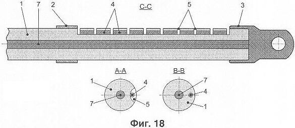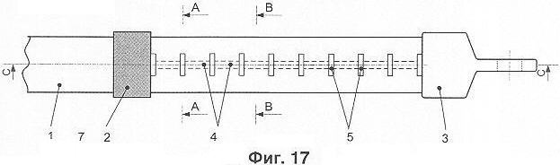 На фиг.17, 18 показан вариант разрядника по изобретению, выполненный по кабельной технологии. В качестве основы для изготовления разрядника используется специальная кабельная заготовка с твердой изоляцией, в которой в качестве полого компонента изоляционного тела 1 и дополнительного электрода 7 выступают твердая изоляция и жила кабеля соответственно. На поверхность такой кабельной заготовки накладывается металлическая проволока или полоса, а затем наносится (например, экструдированием с привариванием к изоляции кабеля) еще один слой твердой изоляции. Таким образом, образуется изоляционное тело разрядника, состоящее из изоляции кабельной заготовки (образующей полый компонент) с нанесенным на нее дополнительным слоем изоляции. Затем, например, сверлением или фрезерованием в изоляционном теле 1 выполняются камеры 5, образующие разрядные промежутки между промежуточными электродами 4 (предпочтительно) между основными электродами 2, 3 и смежными с ними промежуточными электродами 4. При сверлении камеры имеют поперечное сечение круглой формы, а при фрезеровании – прямоугольной или щелевой. Для более компактного расположения промежуточных электродов и уменьшения габаритов разрядника указанные выше металлическая полоса или проволока могут навиваться по спирали аналогично варианту разрядника, показанному на фиг.16. При спиральном расположении щелевых камер необходимо следить за тем, чтобы щели камер, принадлежащих соседним виткам, не были направлены друг на друга. В этом случае, как показали эксперименты, каналы разрядов при выдувании из камер могут слиться в единый канал, расположенный в воздухе поверх изоляционного тела, что приводит к резкому снижению дугогасящих свойств разрядника. Поэтому щелевые камеры на соседних витках должны быть расположены с некоторым дополнительным смещением или с взаимным угловым разворотом.