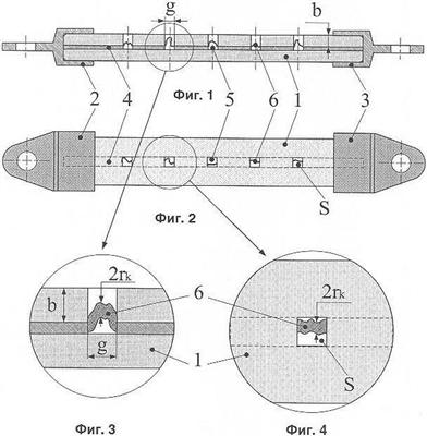 При воздействии на разрядник импульса перенапряжения от первого основного электрода 2 по направлению ко второму основному электроду 3 развивается разряд, последовательно пробивая промежутки между промежуточными электродами 4. Данный разряд, в зависимости от условий его формирования, может развиваться в различной форме, например в виде стримерного, лавинного или лидерного разряда. Далее для облегчения понимания и большей конкретности осуществление изобретения будет рассматриваться только на примере стримерного разряда, хотя оно применимо и к другим видам разряда. В процессе образования и развития искрового канала 6 происходит его расширение со сверхзвуковой скоростью. Как будет подробно описано далее, если сделать объемы разрядных искровых камер 5 между промежуточными электродами достаточно малыми, в результате развития разряда внутри камер 5 будет создаваться высокое давление. Под действием этого давления каналы 6 искровых разрядов между промежуточными электродами перемещаются к поверхности изоляционного тела (как это схематично показано на фиг.1 и 3) и далее выбрасываются наружу в окружающий разрядник воздух. Вследствие возникающего дутья, приводящего к удлинению каналов между промежуточными электродами, суммарное сопротивление всех каналов увеличивается. В результате общее сопротивление разрядника возрастает и происходит ограничение импульсного тока грозового перенапряжения. По окончании импульса грозового перенапряжения к разряднику остается приложенным напряжение промышленной частоты. Однако благодаря тому, что разрядник имеет большое сопротивление, а канал разряда разбит на множество элементарных каналов между промежуточными электродами, разряд не может самостоятельно существовать и гаснет.