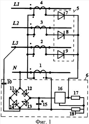 Электромагнитный компенсатор третьей гармоники электрической сети содержит включенные в нейтральный N и фазные проводники L1-L3 измерительный трансформатор тока 1 и дополнительные трансформаторы тока 2, 3, 4, к вторичным обмоткам которых подключены выпрямитель 5 и преобразователь 6 (фиг.1). Диоды 7, 8, 9 выпрямителя 5 своими анодами образуют общую точку с положительным выходным зажимом преобразователя 6.