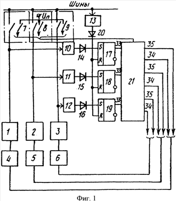 Выстроенная очередь блока 21 сохраняется до следующего положительного полупериода напряжения. При переходе кривой напряжения Ua через нуль, нуль-орган 13 формирует импульс, который через диод в прямом направлении поступит на R-входы триггеров 17, 18, 19 и приведет их в исходные состояния. Исчезновение информации (заявок) на входе блока 21 приведет блок 21 в исходное состояние, при котором на всех выходах его появятся “Лог.0”. Учитывая, что тиристорные ключи обмоток возбуждения 4, 5, 6 обладают памятью, то управление их как бы замораживается.