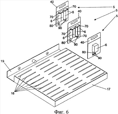 Это техническое решение использует такую конструкцию блистерной упаковки 5, которая изображена на фиг.15; в частности, на фиг.15 изображена упаковка 5, содержащая аккумуляторы 6 типа АА, при этом аналогичные решения возможны и для не показанных на чертеже конфигураций аккумуляторов типов ААА и на напряжение 9 В.