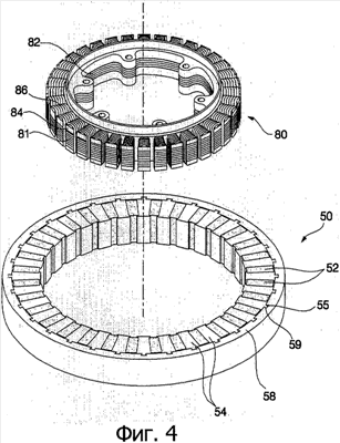 Как показано на фиг.4 и 5, электродвигатель содержит индуктор 50 и якорь 80.