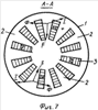 Третьим классом электрических машин могут быть машины радиального движения. Расположение векторов F, Ф и I для них относительно оси А-А дано на фиг.5 и 6. Здесь, как и для классов вращательного и поступательного движения, рассмотрены различные варианты расположения векторов Ф и I при сохранении радиального направления вектора F. Если машина по варианту фиг.5 имеет круглое поперечное сечение, то векторы индукции от потока Ф замыкаются по концентрическим окружностям относительно оси А-А. Благодаря этому в машине варианта по фиг.5 устройство системы возбуждения индуктор может быть более простым при использовании постоянных магнитов, что затруднено по варианту фиг.6.