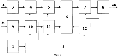 В момент t1 (фиг.2) код первой начальной частоты Аi из первого регистра памяти 3 записывается в первый цифровой накопитель 4, а код второй начальной частоты Bk из второго регистра памяти 9 записывается в третий цифровой накопитель 10.