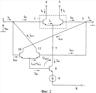 Дифференциальный усилитель фиг.2 содержит входной параллельно-балансный каскад 1, имеющий первый 2 и второй 3 входы, первый 4 и второй 5 выходы, транзистор источника опорного тока 6, коллектор которого связан с общей эмиттерной цепью 7 входного параллельно-балансного каскада 1, а эмиттер соединен с шиной источника питания 8 через токостабилизирующий двухполюсник 9, первый 10 и второй 11 вспомогательные транзисторы, базы которых соединены с первым 2 и вторым 3 входами параллельно-балансного каскада 1, а эмиттеры связаны друг с другом, причем все основные транзисторы схемы имеют один тип проводимости. База транзистора источника опорного тока 6 связана с объединенными эмиттерами первого 10 и второго 11 вспомогательных транзисторов, коллектор первого 10 вспомогательного транзистора соединен со вторым 3 входом входного параллельно-балансного каскада 1, а коллектор второго 11 вспомогательного транзистора связан с первым 2 входом входного параллельно-балансного каскада.