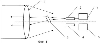 Пример 3. В одном из вариантов реализации терминал системы открытой оптической связи содержит объектив 1, выполняющий роль антенны для приема сигналов извне и передачи сигналов. В фокальной области объектива 1 размещены источник 2 передаваемого оптического излучения, соединенный с блоком 3 формирования передаваемого сигнала, и фотоприемник 4, соединенный с блоком 5 обработки принимаемого сигнала. Все упомянутые средства могут быть выбраны из числа известных, применяемых в данной области техники. На пути пучка передаваемого излучения от источника 2, между источником и объективом, размещена прозрачная пластина 6, выполненная в виде оптического клина, размер которого в плоскости объектива меньше апертуры объектива. Поэтому пластина не вносит существенного ослабления в величину принимаемого сигнала и не препятствует попаданию пучка принимаемого излучения в фотоприемник.